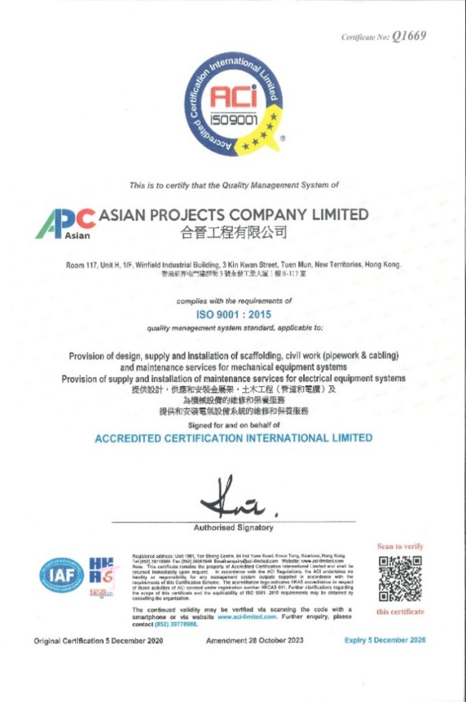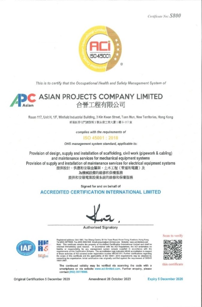 Asian Projects Company Limited (APC) was established in 2019 as a leading E&M (Electrical and Mechanical) and scaffolding contractor specializing in scaffolding work and engineering. The company aims to become the preferred service provider in the industry.